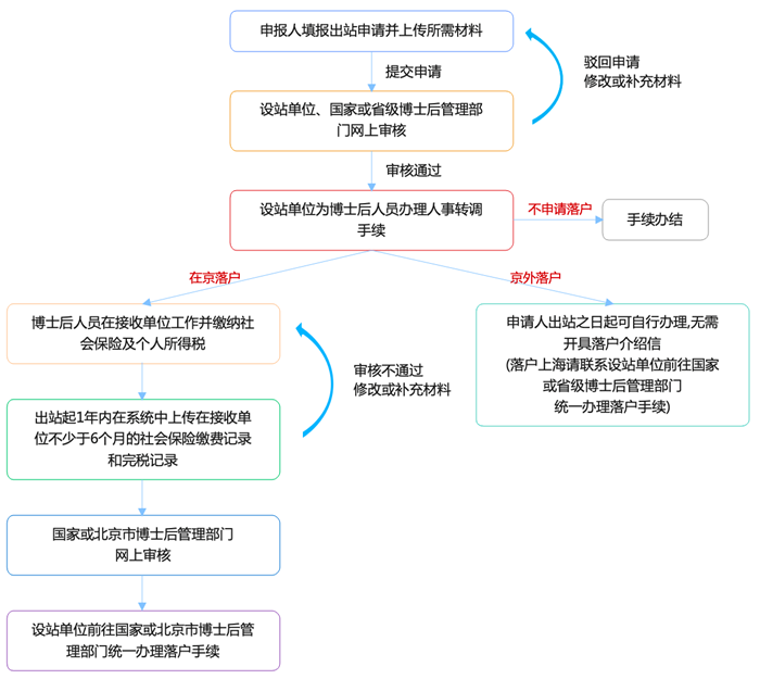4.北京地区博士后人员出站申请落户北京的,由设站单位到国家或北京市博士后管理部门统一办理户口迁落手续。出站落户京外的,本人按预约时间前往博士后进出站服务窗口办理户口迁移介绍信。