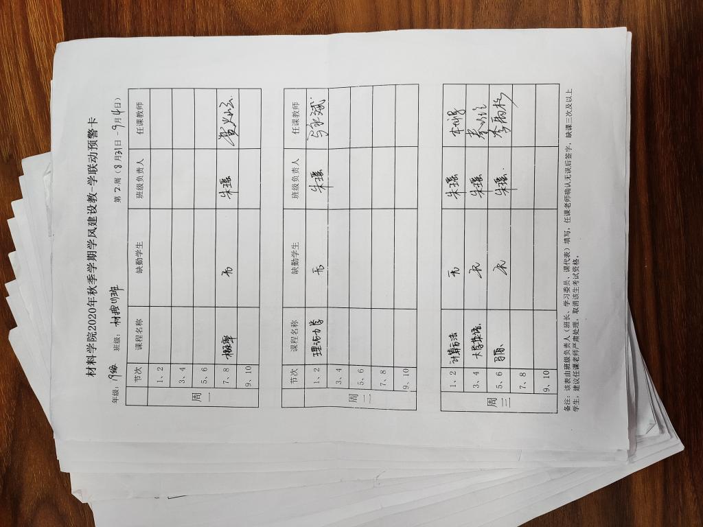 在新学期开始之际,材料学院教-学联动预警制度也紧跟落实。在上课铃响前,班级班干部进行课堂考勤,填写学风建设教-学联动预警卡,将班级课堂考勤情况及时上报任课老师与辅导员老师,学风建设教-学联动预警卡建立了班干部→任课老师→班主任、辅导员这样一套严谨、具有层次性的管理预警机制,并且材料学院建立与任课老师的课堂缺课反馈群,确保任课老师、班主任、辅导员及时沟通掌握班级学风学情。材料学院学风预警制度充分提高了新生对大学课堂的重视程度,督促同学们做好上课准备、集中上课时的注意力,确保教学活动有序进行。