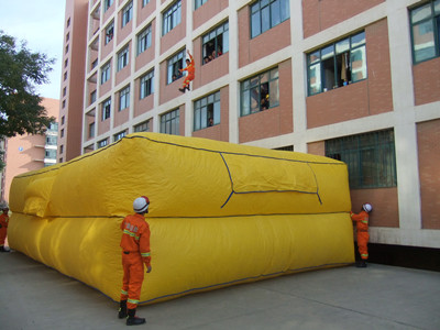 消防人员演示安全着落气垫床
