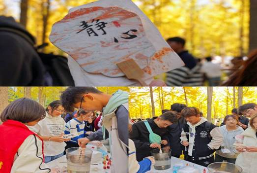 两委会还特别邀请学校墨研月书画协会和手工云剪纸协会,在银杏林中展示优秀书法作品及剪纸作品,同学们在银杏林中学习书法和剪纸技巧,感受中华优秀传统文化带来的文化沁润。